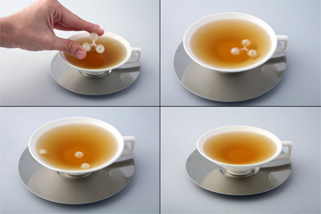 上の写真のように3つの玉が、徐々に溶けて分裂していきます。溶けていく様子を目で楽しみながら紅茶を楽しむことが出来るシュガーです。