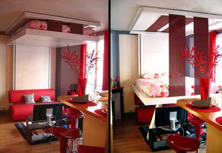 シーリングベッドです。ベッド自体が上に収納されるためベッドを使わない時は部屋を広く使うことが出来ます。