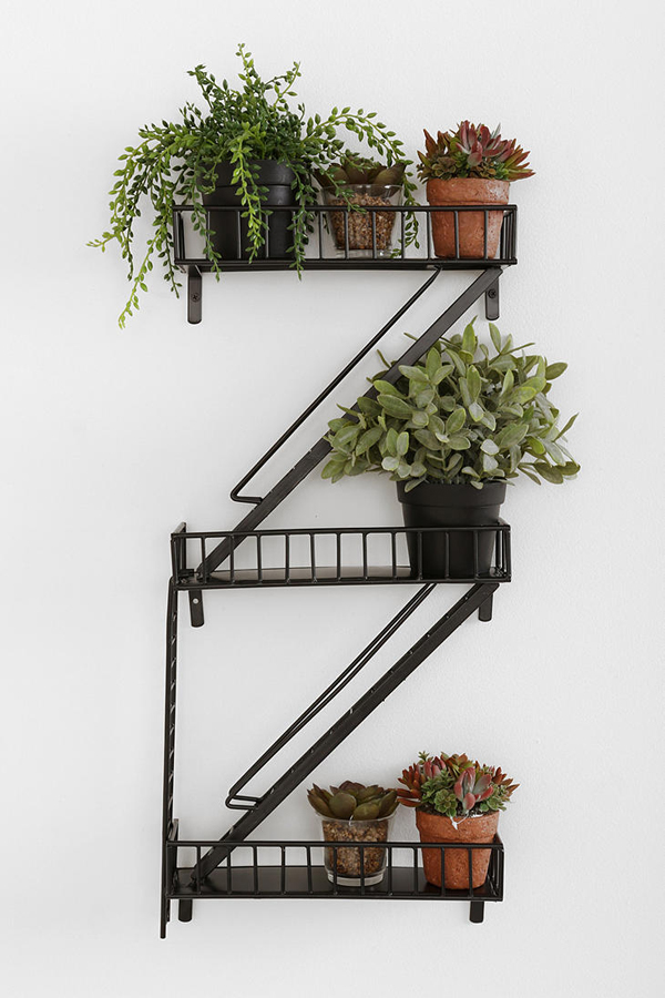 上の写真が噂の壁掛け棚「Fire Escape Wall Shelf」と言います。棚として機能するのは上の方の台と、中間の台、さらに下の方の台の3つですが、その中間それぞれを結ぶはしごにもいろいろなものを吊るしたり、置いたりすることができそうです。