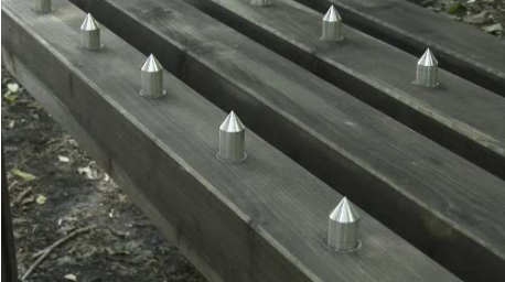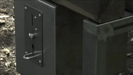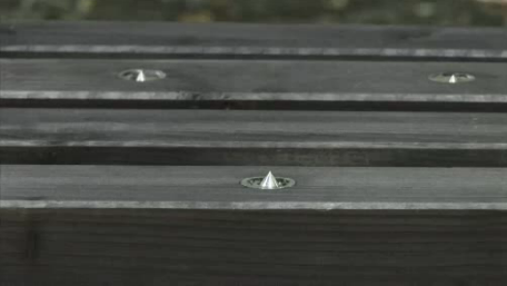 お金を入れないと座ることが出来ないベンチ。お金を投入する前は上の写真のようにベンチが針の山となっています。