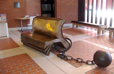 大きな本の形をしたベンチです。逃げることが出来ないように重たい鉄球で繋がれています。