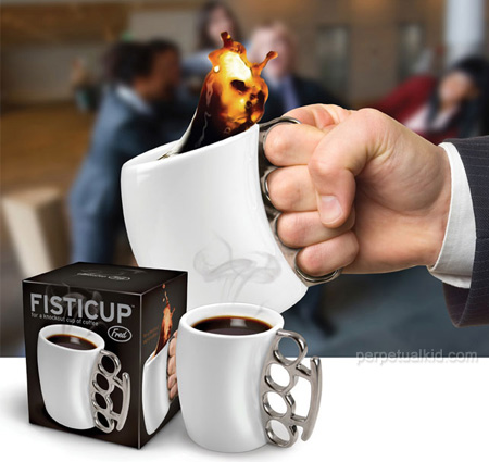 こちらはメリケンサックのマグカップ。コーヒータイムに、突然、戦いを挑まれてもこれがあれば大丈夫。マグカップが、すぐに武器へと変わります。
