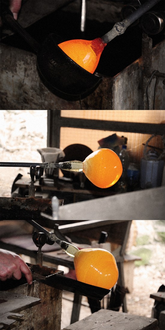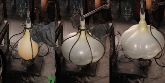 上の写真はニンニクの形をした照明「Garlic Lamp」の製造工程を現した写真です。ガラス玉が赤くなり伸ばされていっている様子がよくわかります。