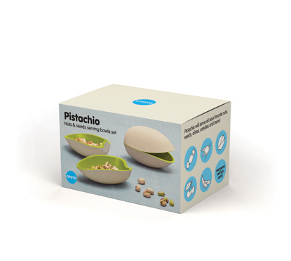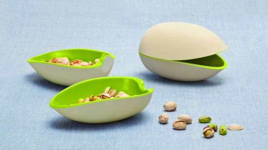 ピスタチオの形をした、真ん中からまっぷたつに二つに分かれることで殻入れとなるボウル「ピスタチオ ボウルセット」
