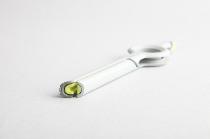 上の写真が今回紹介するペンParaline Dispenserです。一瞬八としてしまいますが、仕組みは単純。後部の黒い車輪のようなものがテープとなっており、それがペンの内部空間を伝っていきペン先に流れていっているという仕掛けとなっています。