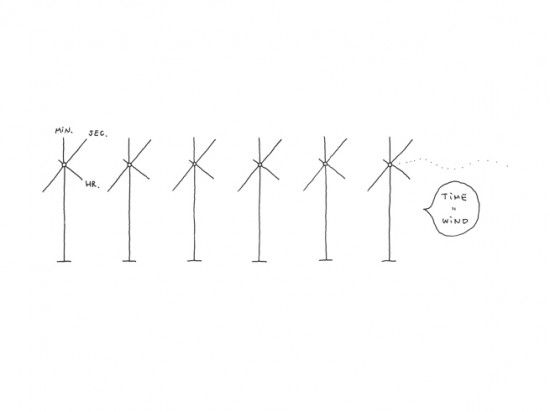上の写真のように複数の時計を一列に並べ、ピタリと同じ時を刻み続けることで風車が並ぶ丘のような風景になることを想定してつくられました。
