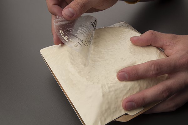 続いて、透明なシールについてるタネを先ほどの土の上に植え付けます。