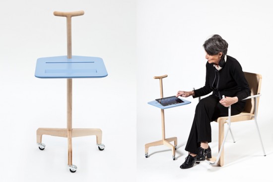 最後に、一番右のT-caneと呼ばれる「T」タイプのもの。これはiPadなどのタブレットを置く為のホルダーがついているタイプの杖となっています。座った時にちょうどいい位置にタブレットを置くことが出来、そのままインターネットに繋げることで情報検索やメールなどを楽しむことが出来るようになっています。