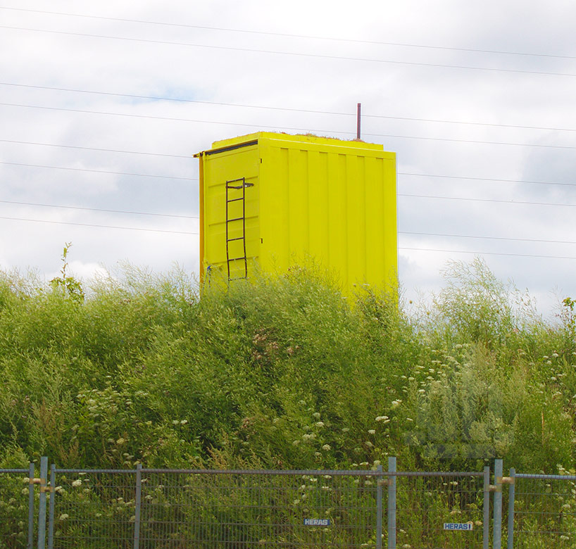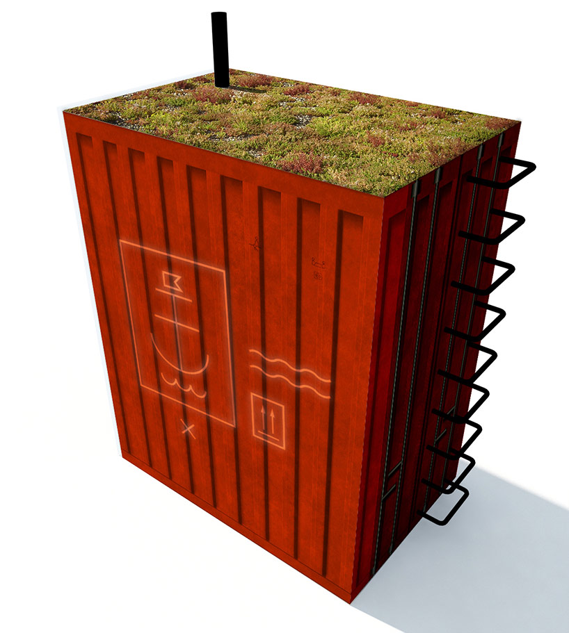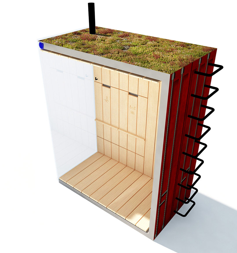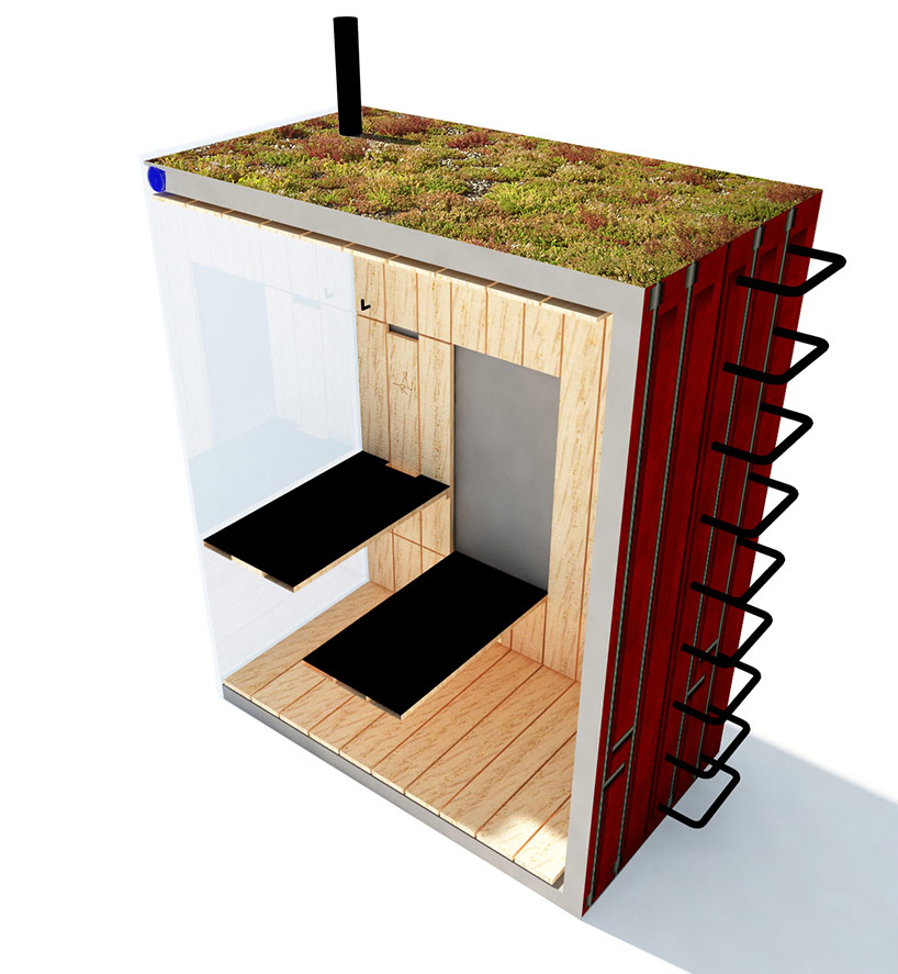 このデザインは輸送用コンテナをリサイクルし使用しているため環境に優しく、屋根の上からぽつんと出た煙突によって換気を行うことが出来ます。