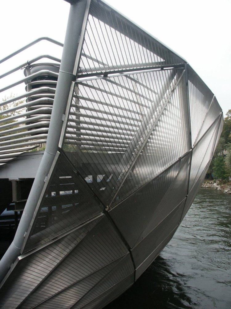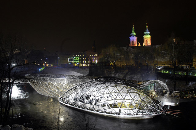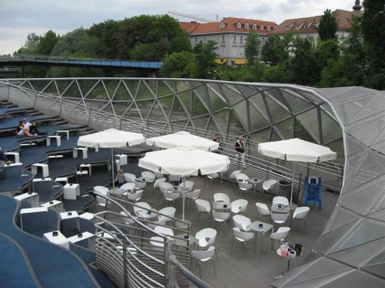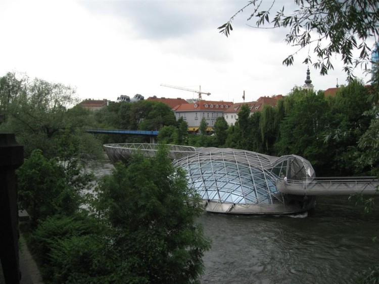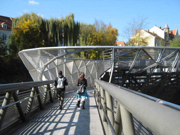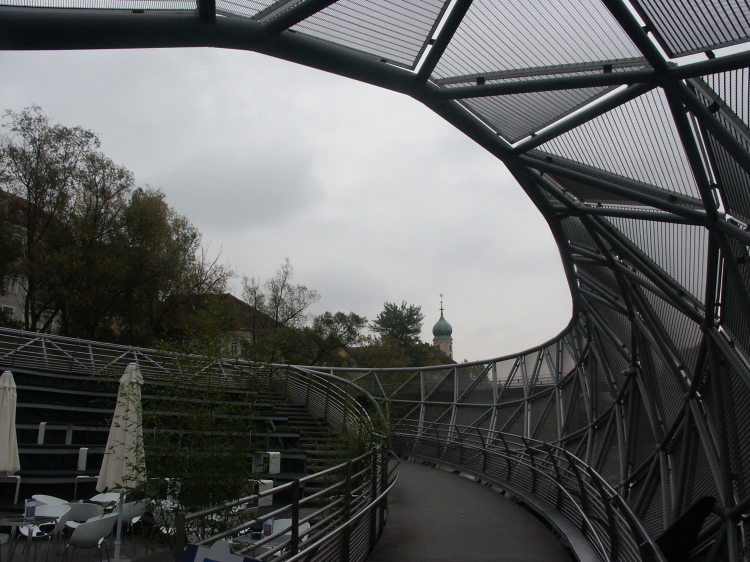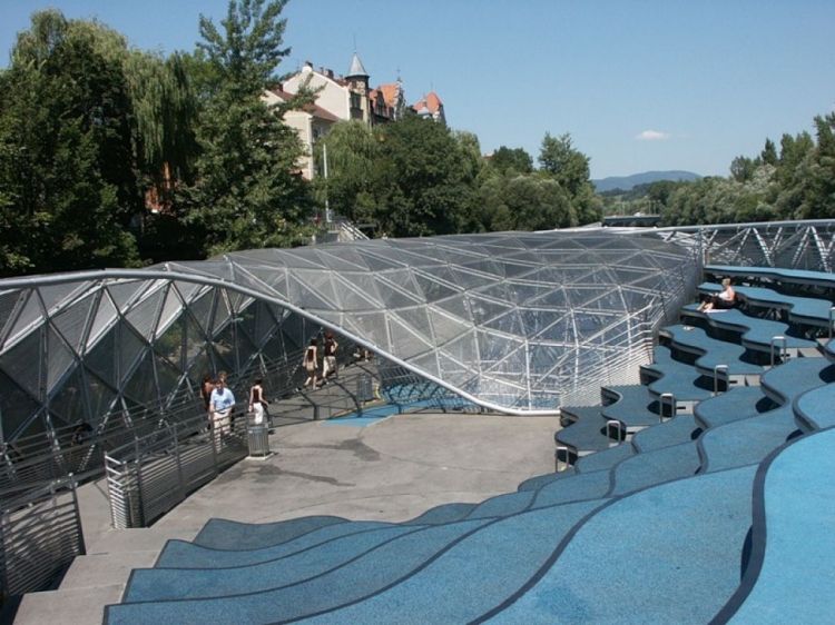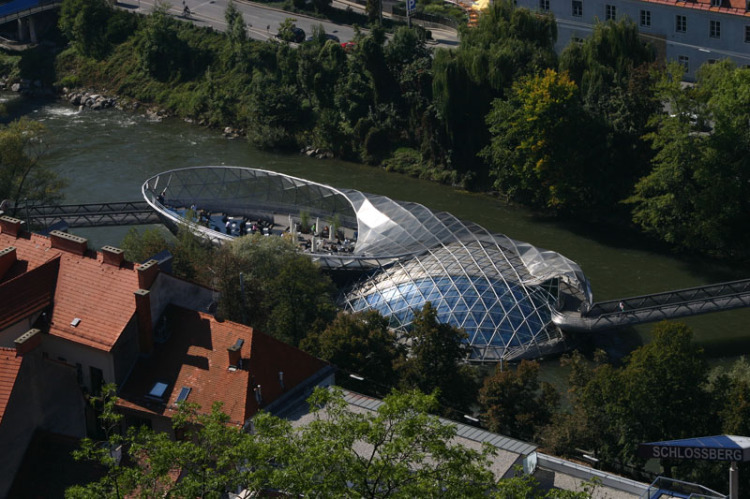 オーストリア、グラーツに流れるムール川を横断するように架けられた橋があります。名前を「Aiola Island Bridge(アイオラ・アイランド・ブリッジ)」と言い2003年にニューヨークの芸術家「ヴィト・アコンチ(Vito Acconci)」によってデザインされました。