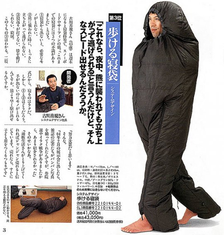 歩ける寝袋です。なんと「「これなら、夜中、熊に襲われても立ち上がって逃げられる」と言うんだけど、そんなスピードが出せるんだろうか」と自分でいってしまっています。