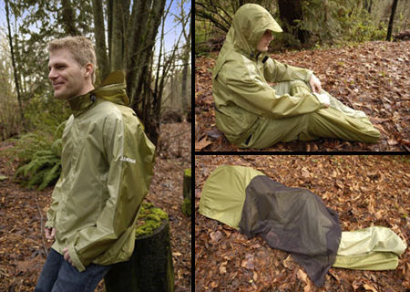 上の写真左側のウォータープルーフの上着がそのまま寝袋に変身するという素晴らしい寝袋。