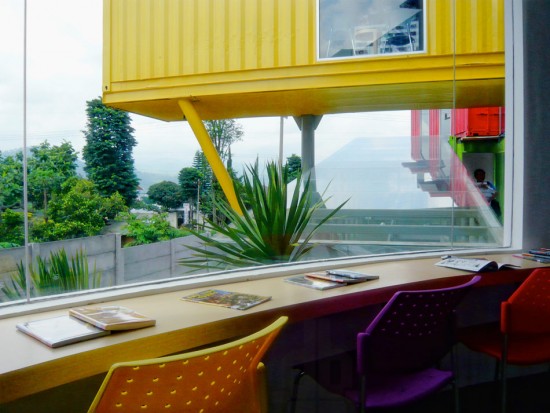 輸送用のコンテナを使用してつくられた、小さな診療所と図書館が併設されたカラフルなコンテナハウスライブラリー。13