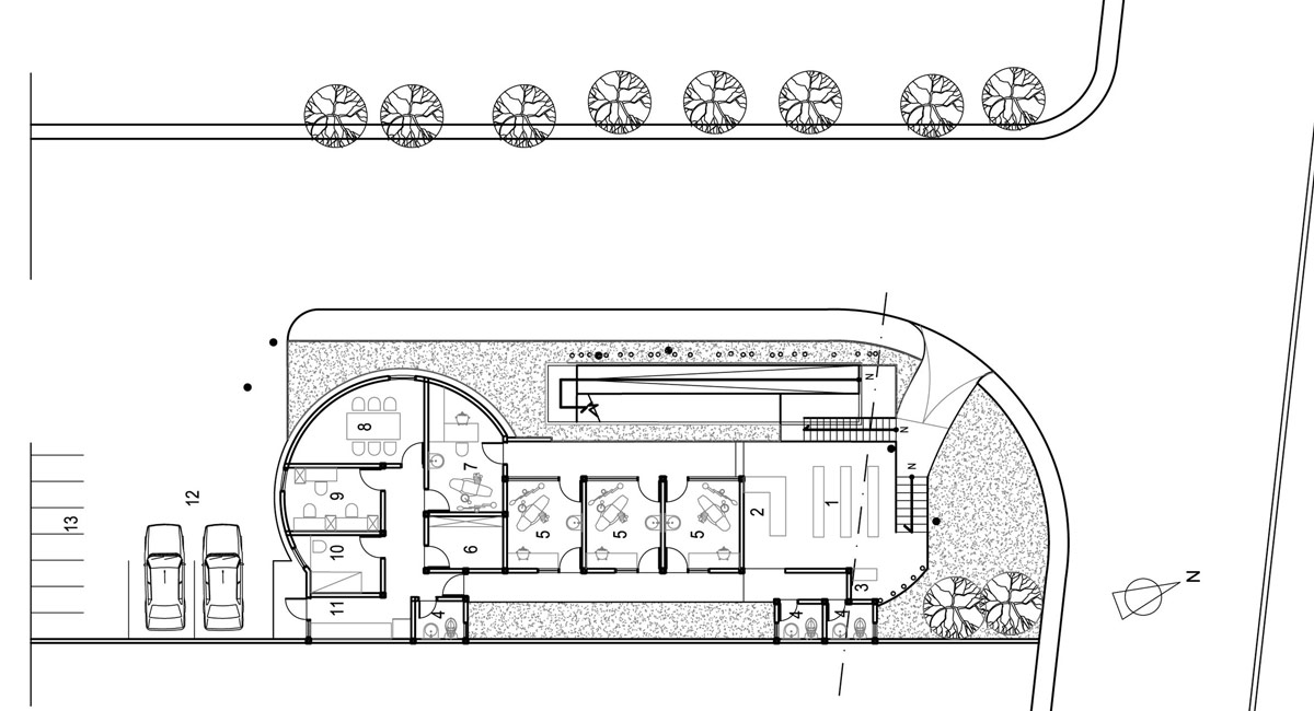 小さな診療所を兼ねた図書館のコンテナハウスの外観