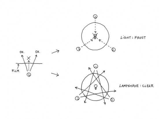 また、光がフィルムに対して常に直角に当るため、空間には半透明のランプシェードを透過したような柔らかい光が漏れる結果となったようです。