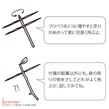 「プロペラを2つに増やすと浮力があがって更に空高く飛ぶよ。」