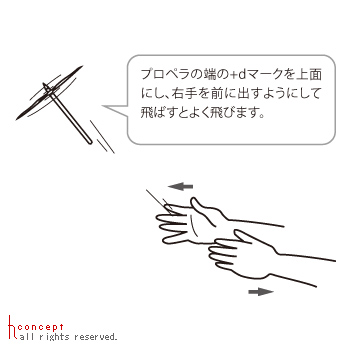 「プロペラの端の+dマークを上面にし、右手を前に出すようにして飛ばすとよく飛びます」