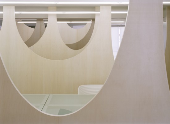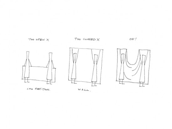 通常のオフィス用パーティションとの大きな違いは、大きな布を両手で持ち上げたようなイメージとなっていること。