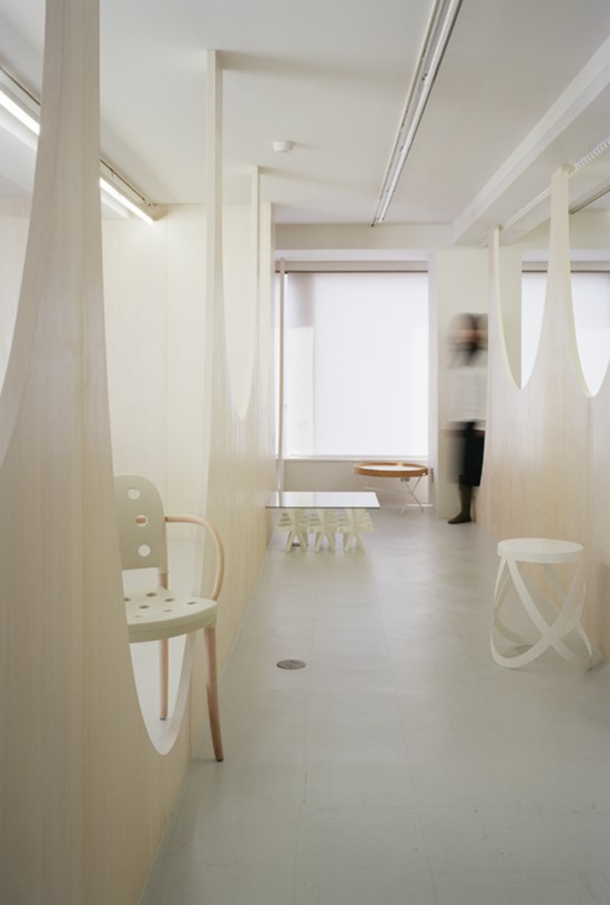 要所要所に、nendoが手がけたデザインのスツール等、自社商品が展示してあります。正面に見えるのはバレエのリボンをモチーフにしたスツールですね。