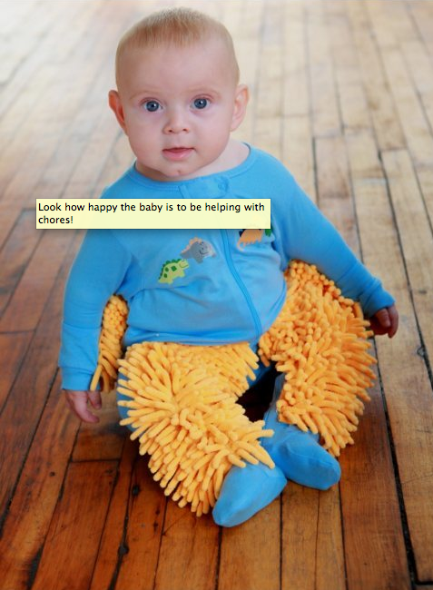 でも、本当なんです。この「BABY MOP」を赤ちゃんに着せるだけで、モップみたいに部屋のあらゆるところを掃除してくれます。ああ、なんて画期的なアイテムなのでしょう。