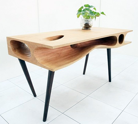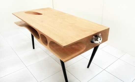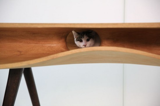 まるでアリの巣のように穴が空いているこのテーブル。実はこのスペースに猫が忍び込むことが出来るように設計されており、このテーブルがそのまま猫の遊び場として機能します。