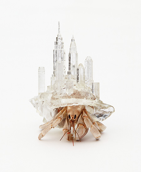 やどかりに、私の作った「やど」を渡し、やどかりが気に入れば「やど」として背負ってもらう作品。 この作品は、フランス大使館での展覧会”No Man’s Land”への出展を期に、スタートした。 旧在日フランス大使館の建物は2009年に解体、隣接する土地に新しい大使館が建てられた。”旧”在日フランス大使館の土地は、2009年10月まで「フランス」だったが、以後50年間「日本」になり、その後また「フランス」になるという。この話に衝撃を受け、やどかりの「やど」を引っ越しする習性へと飛躍した。 同じ土地であるにもかかわらず、平和に国が入れ変わっている事実。中身は同じでありながら、背負う「やど」によって、すっかり見た目が変わってしまう「やどかり」は、私が渡した、様々な国の建物を模した「やど」を次々と引っ越ししていくことで、国境を軽々と越えていくようにも見える。