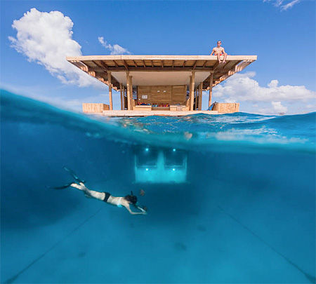 そしてこちらが実際の海中ホテルの写真。プカプカと浮かぶ水上コテージのようになっており、屋上デッキでは日光浴を楽しむことが出来ます。
