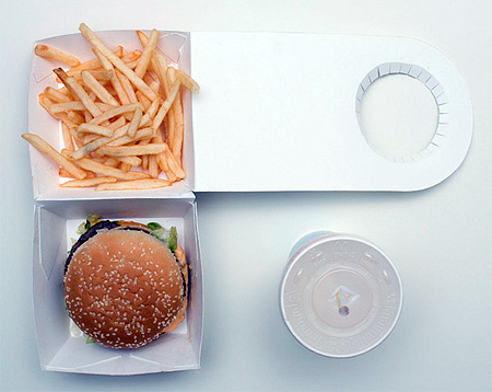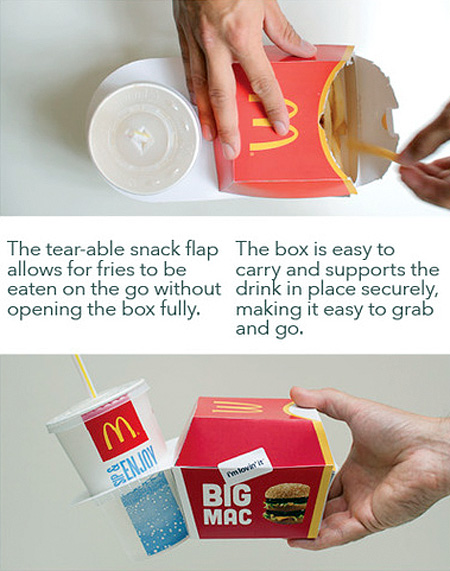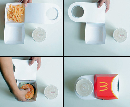 まず、ポテトがビッグマックのうえの空きスペースに収められているということ。そして第二にビックマックのパッケージがジュースを固定する為のドリンクホルダーとなっているという点。