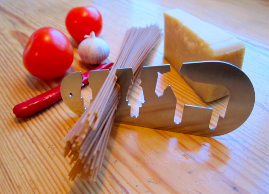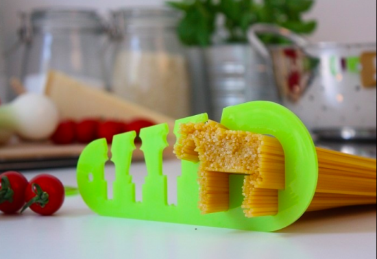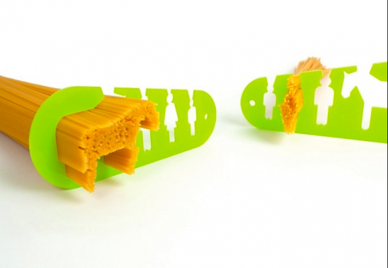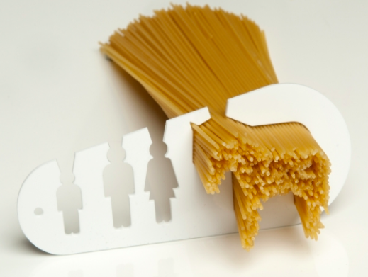 このとってもユニークなパスタ計量器はお父さん、お母さん、子供の分量にあわせてはかることができる優れもの。