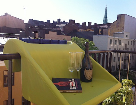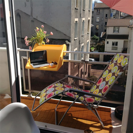 このテーブルは、バルコニーのちょっとした空間を使ってくつろぎの時間を提供します。このテーブルはバルコニーの手すりを使い、設置できるテーブルデザイン。