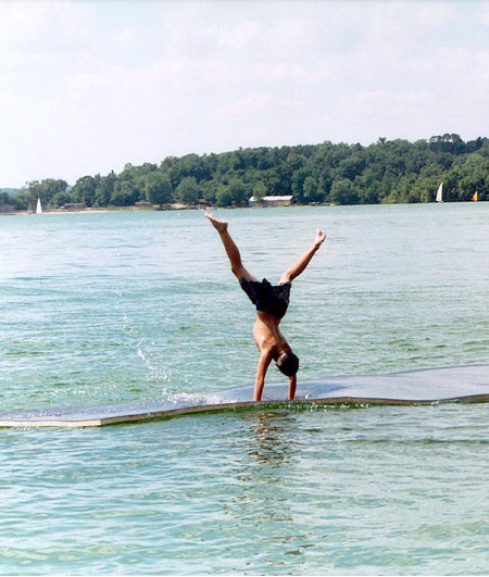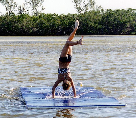 水上で逆立ち。