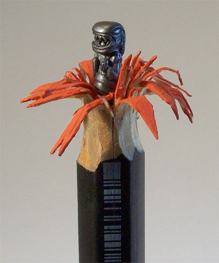 まずはじめの作品はこちら。なんと鉛筆からエイリアンが飛び出してきました!。芯の周りの木の部分もしっかりと削られており、素晴らしい作品となって我々の前に飛び出してきました。