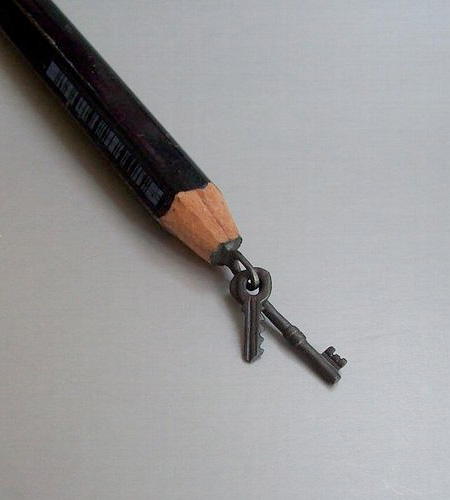鉛筆の芯がひとつの輪っかに結びつけられた2つの小さな鍵になってしまっています。