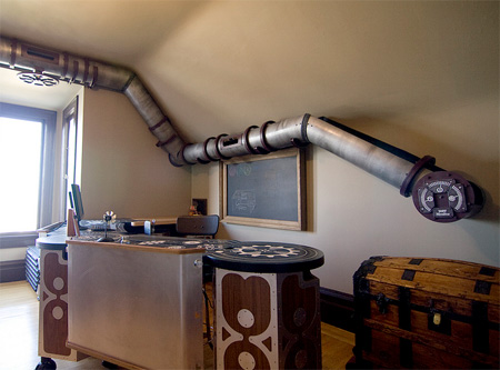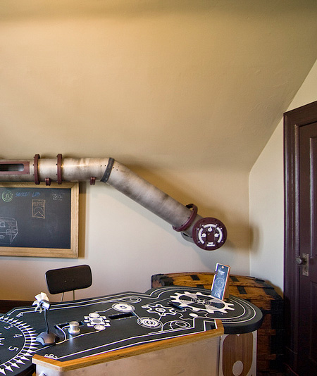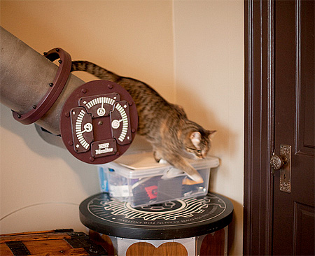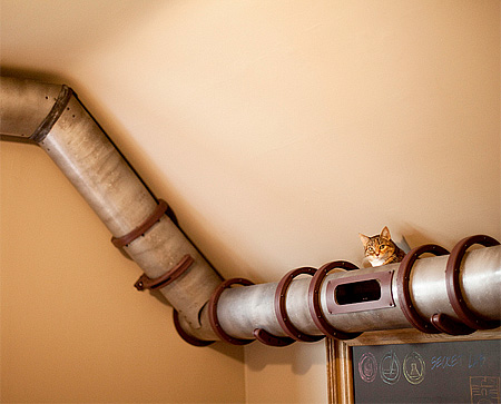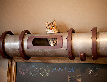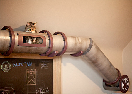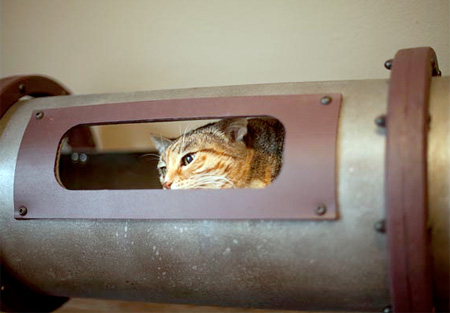 どうですか?部屋の壁にパイプのようなものが備え付けられており、そのパイプの中を移動し目的の場所に行くことが出来る猫の為のトンネル。