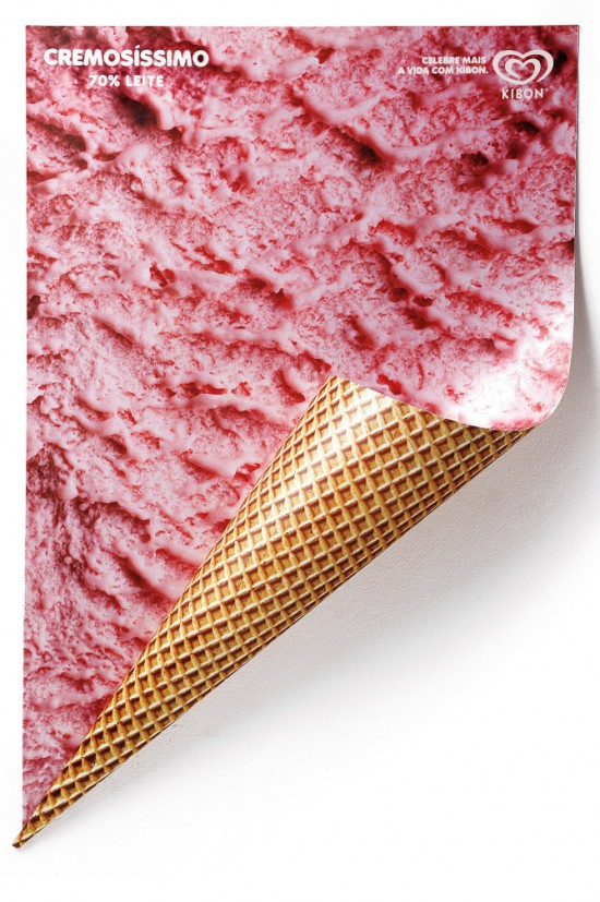 どうですか?このシズル感たっぷりのアイスクリームのポスター。一体どうなっているのかというと、表面いっぱいを使ってリアルなチョコレートの写真を印刷。そして裏面いっぱいにはコーンが印刷されています。