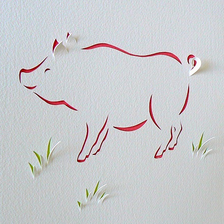 美しい線の切り込みで描かれたブタ。