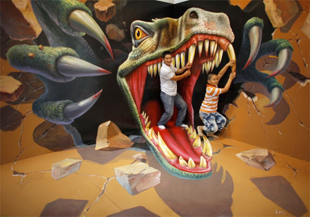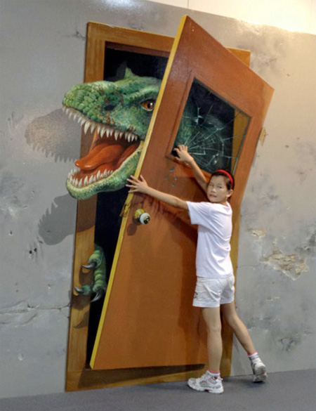 あたかも恐竜がドアを突き破ってしまったかのような描写のトリックアート。