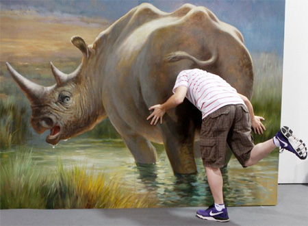 サイのお尻に頭を突っ込んでしまったかのような描写のトリックアート。サイもびっくり!な表情です。
