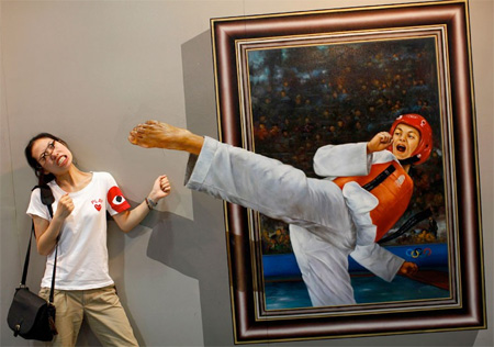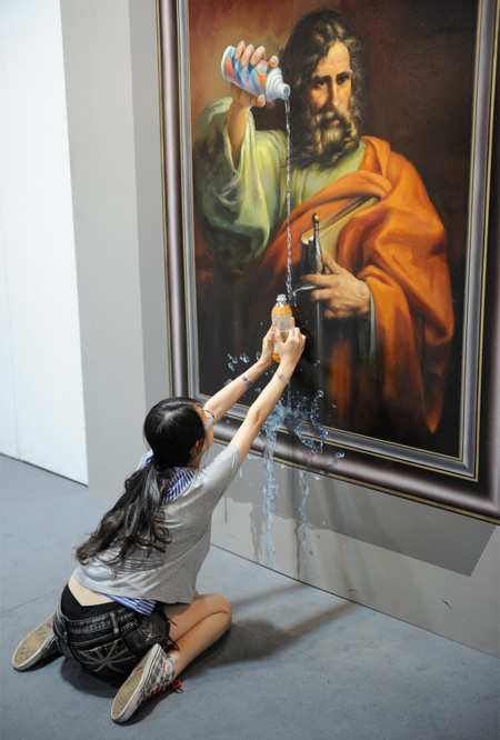 絵画から流れ出る命の水を貰っているかのような描写のトリックアート。