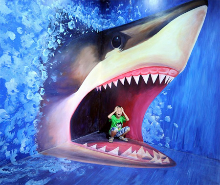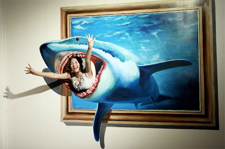 まずはこちらから。絵画からサメが飛び出し、人間の女性が食べられているかのような描写のトリックアート。もちろん人間は絵ではなく本物。