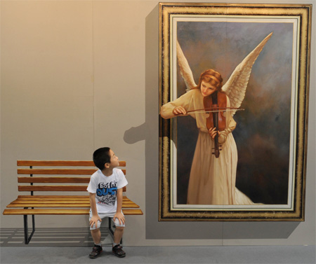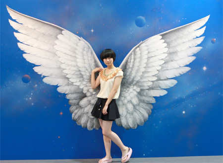 壁に描かれたベンチと、バイオリンでせまる天使のトリックアート。