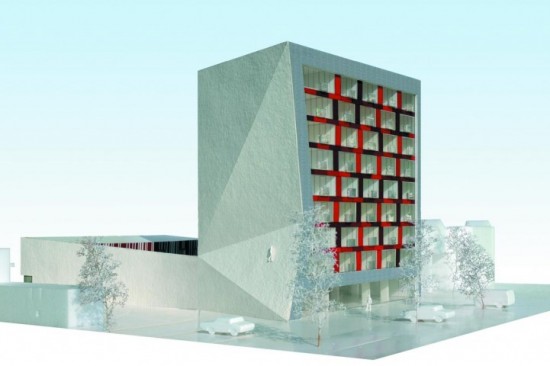 でこれが実際の大学。写真正面の平らな壁にフリークライミングウォールを設置しようと言う計画。ちなみに、この施設は、同時に学生寮にもなっているようです。