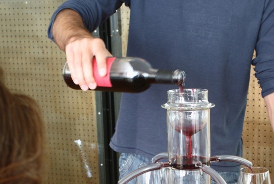 仕組みは至って単純。一番上のワイングラスの形をした注ぎ口にワインを注ぐだけ。後は4つのグラスに注がれるのを待つだけ。