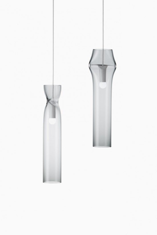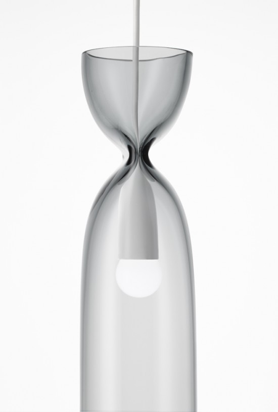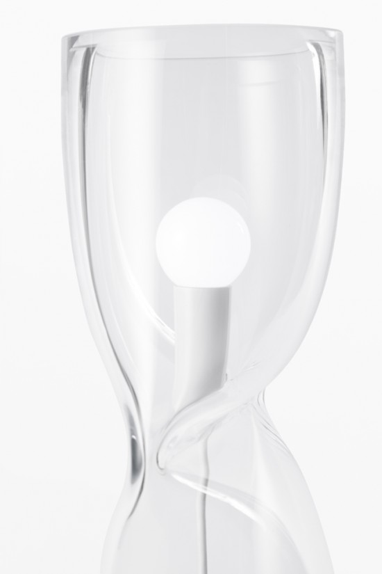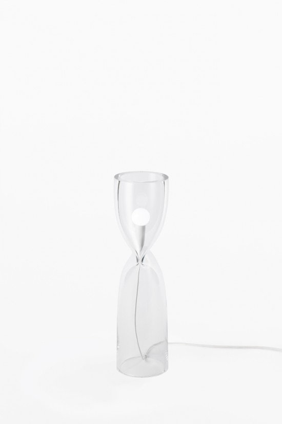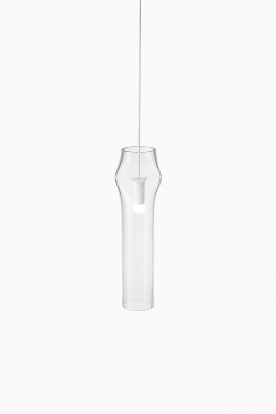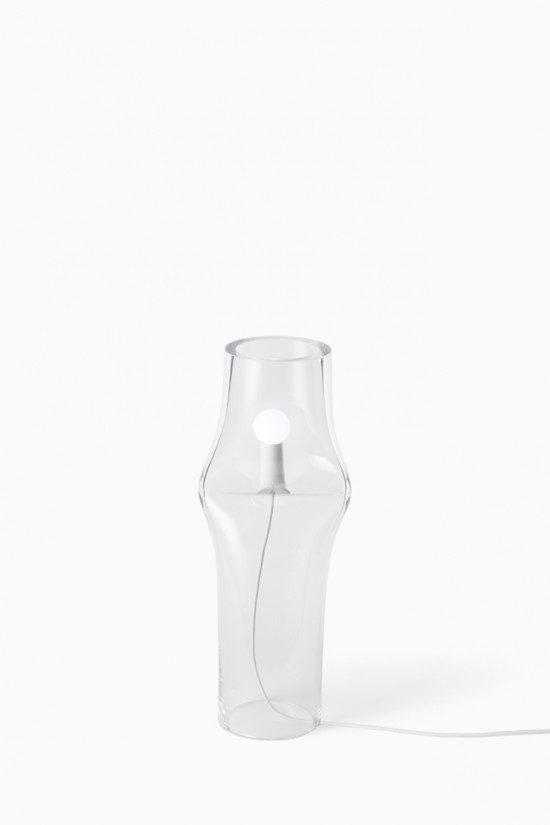 ガラス状の筒の一部を指でつまんだようにわざと潰すことにより光源を支えているデザインのランプとなっています。