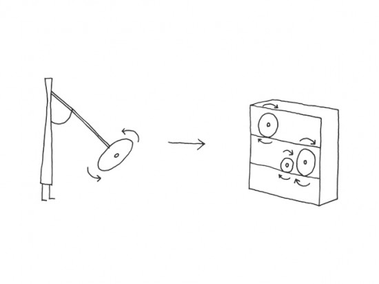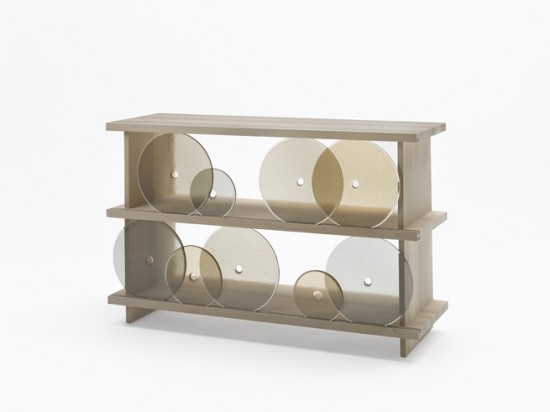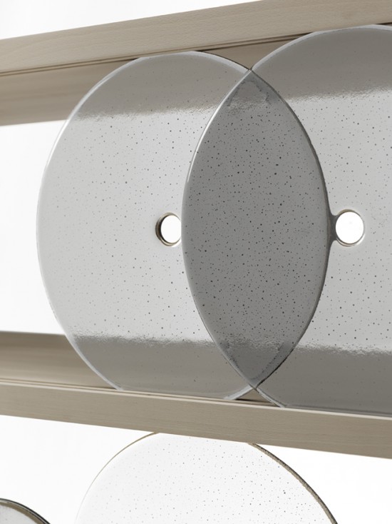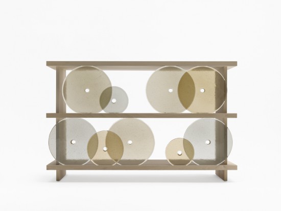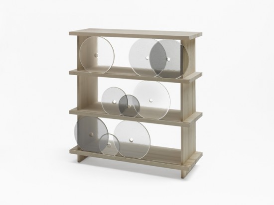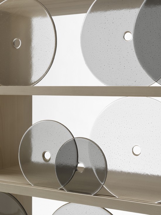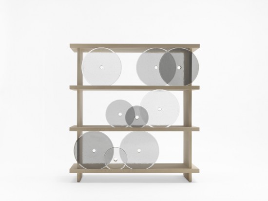 円形のガラス板で出来た扉が開閉するというユニークな発想の棚。円形の扉を右へ左へと転がすことで中にものを収納することが出来るこの棚の名前は「rotating-glass shelf」。
