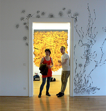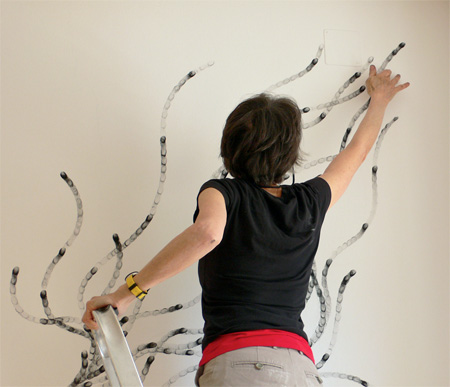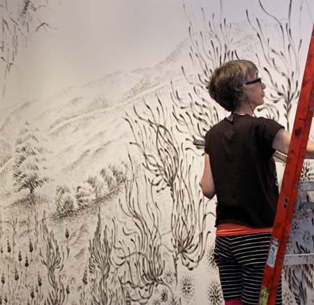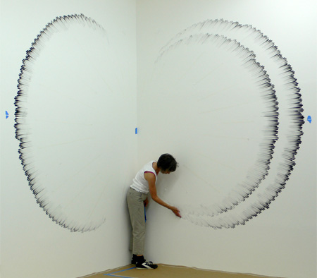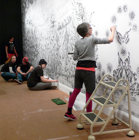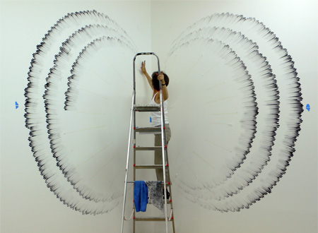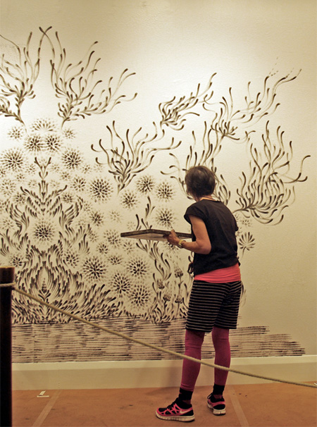中心から何かが広がっているかのような絵。手が届かないところは脚立を使って描いているようですね。