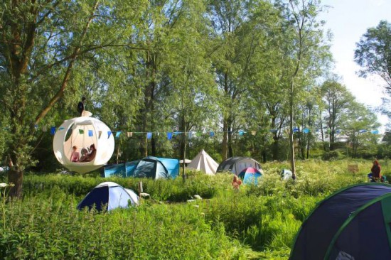 数多くのテントが立ち並ぶ中で、球体型の木に吊るして使うテント「roomoon」を設置すると上の写真のような形に。やっぱりこのテントは非常に目立ちます。このテントは、ぶらぶらと空中に浮かぶ感覚を楽しむことが出来ます。