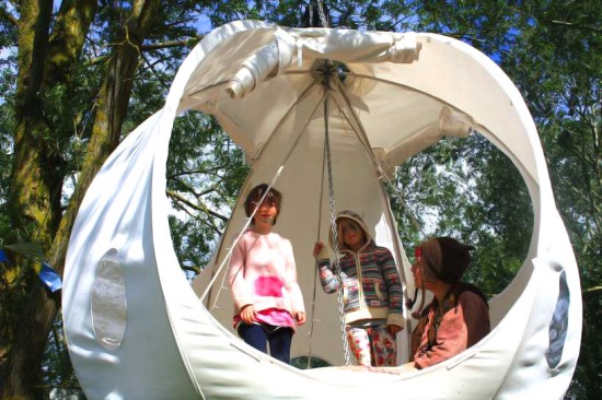 どうですか。まるで高い木に吊るされた月から地上を見守っているかのようにさえ見える、このテント。球体型の形がとっても素敵。薄暗い森の中に吊るされると、そこはもうファンタジーの世界の住人のよう。