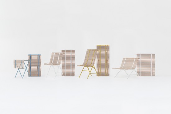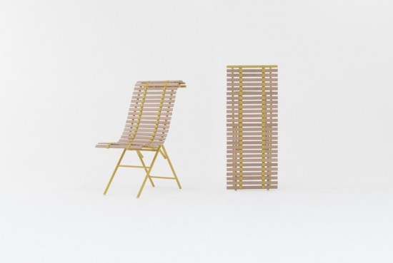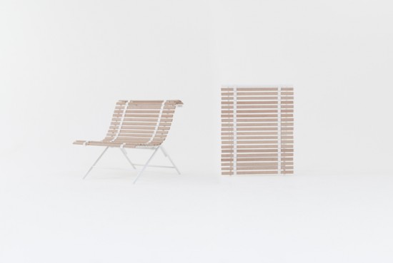 すだれと椅子の両方の機能をもつ椅子のご紹介です。今回紹介する椅子「sudare」はベランダやテラスといったコンパクトな屋外空間のために開発された家具コレクションだそうで、使わない時に折り畳むと自立し、手すりなどの前に置くことでスダレ状のパーティションとなる仕様となっています。