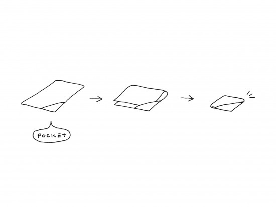 上の写真が「towel-tab」ですが右下端にポケットがついています。これに倣って折り畳むことにより左下の様なコンパクトかつ綺麗なサイズに折り畳むことが出来ると言う訳。